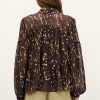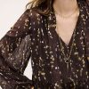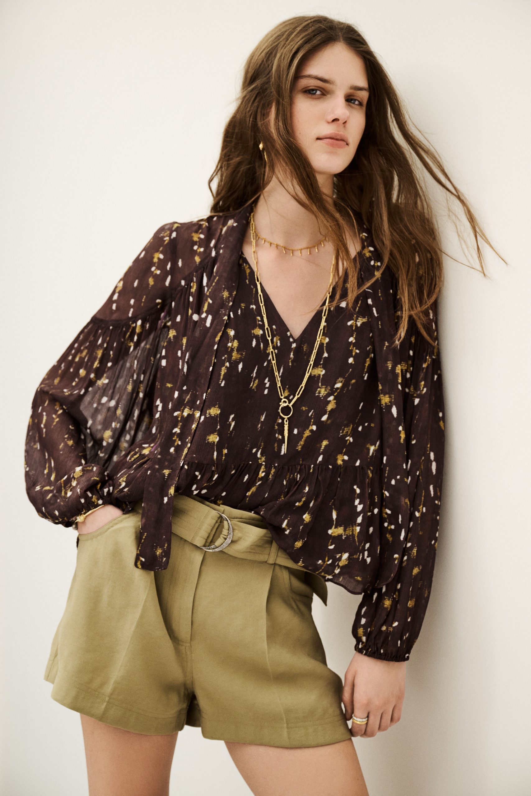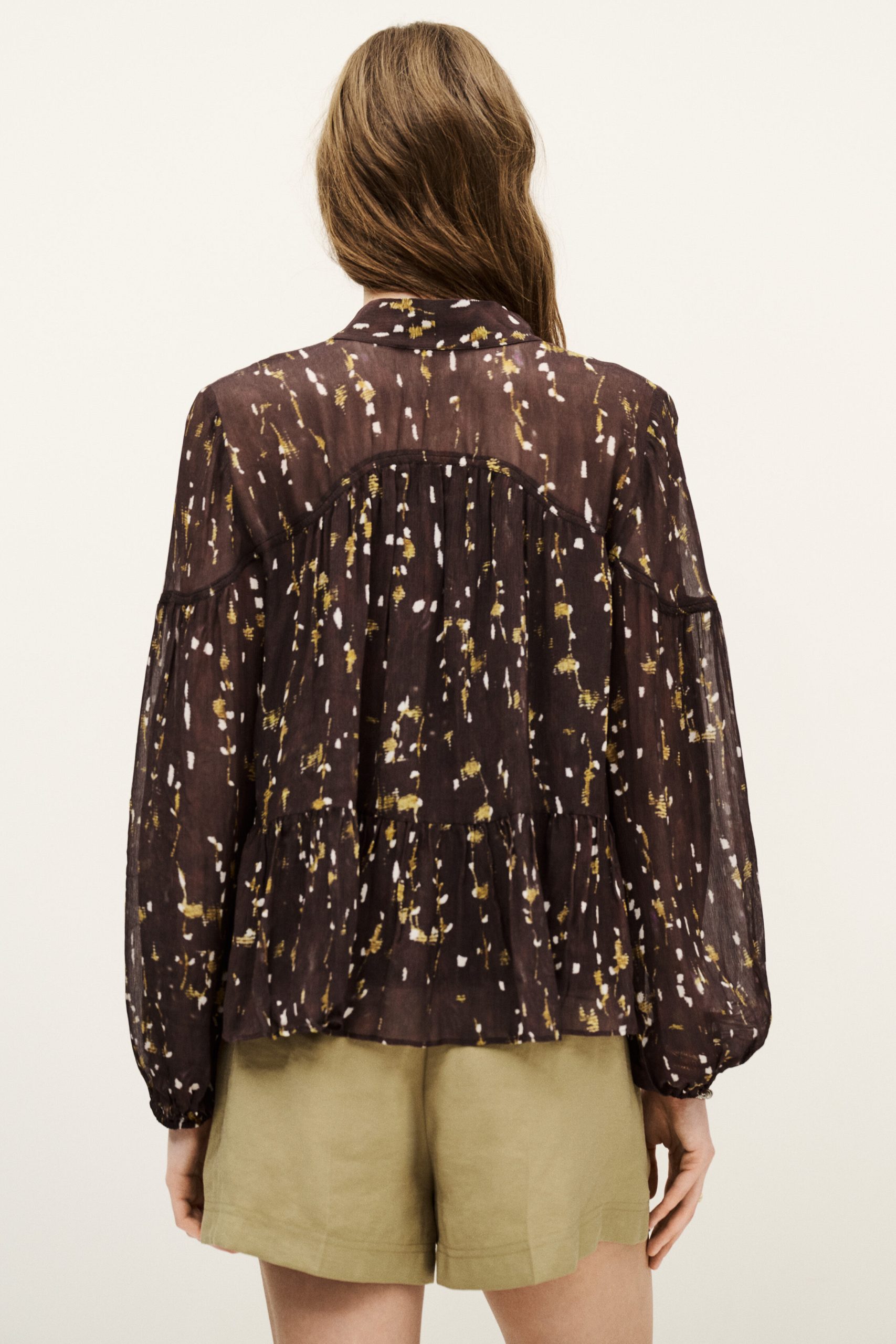 – Loose fit- Printed voile- Gathered frill on the base- Lining- Slightly puffy sleeves with elasticated cuffs- Open lavaliere collar- Contrasting topstitchesThe viscose in this model is made from wood pulp from sustainably managed forests.