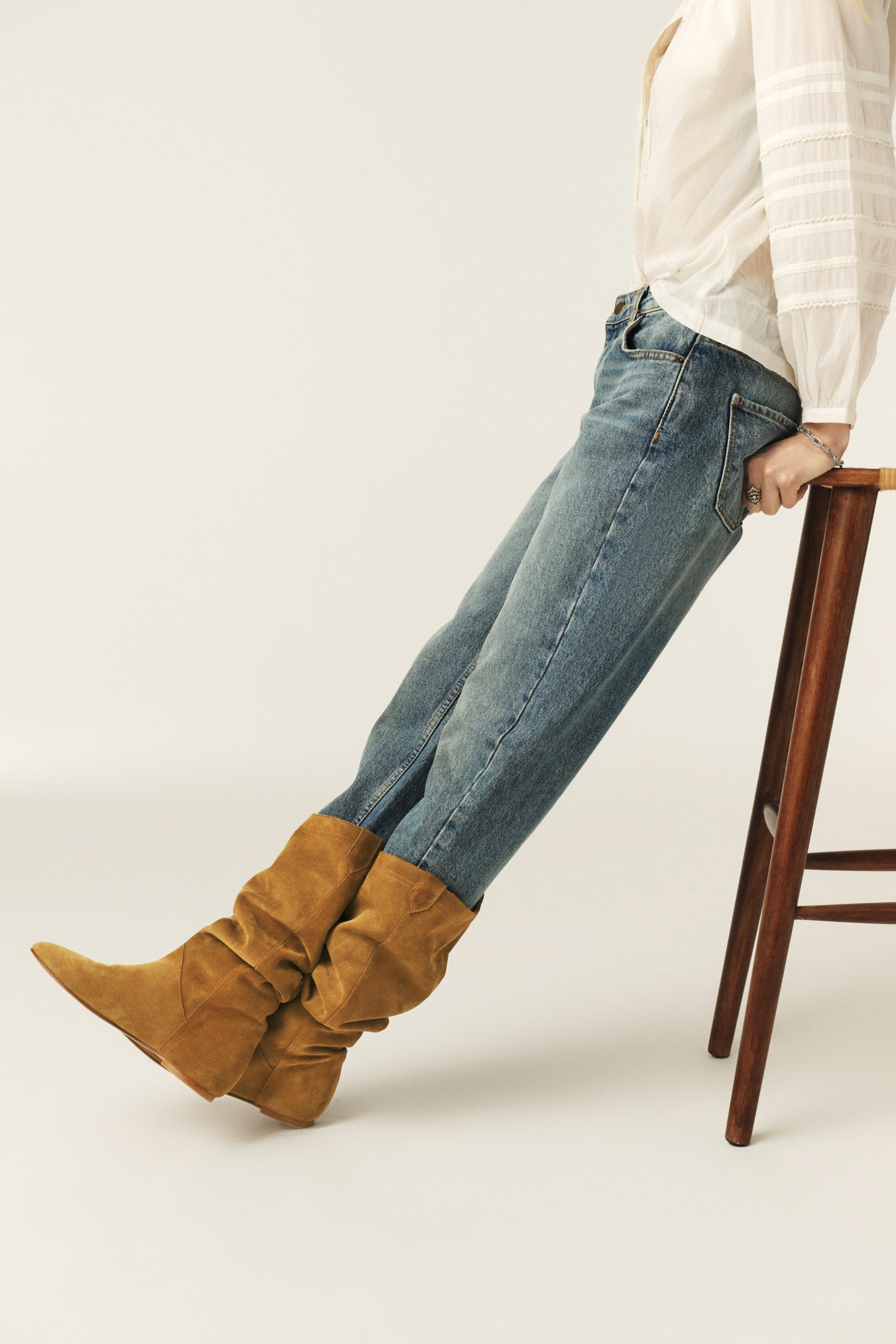 – High shaft- Western edges- Straps on the top- Slip-on style- Pleated- Extra flat heel