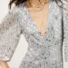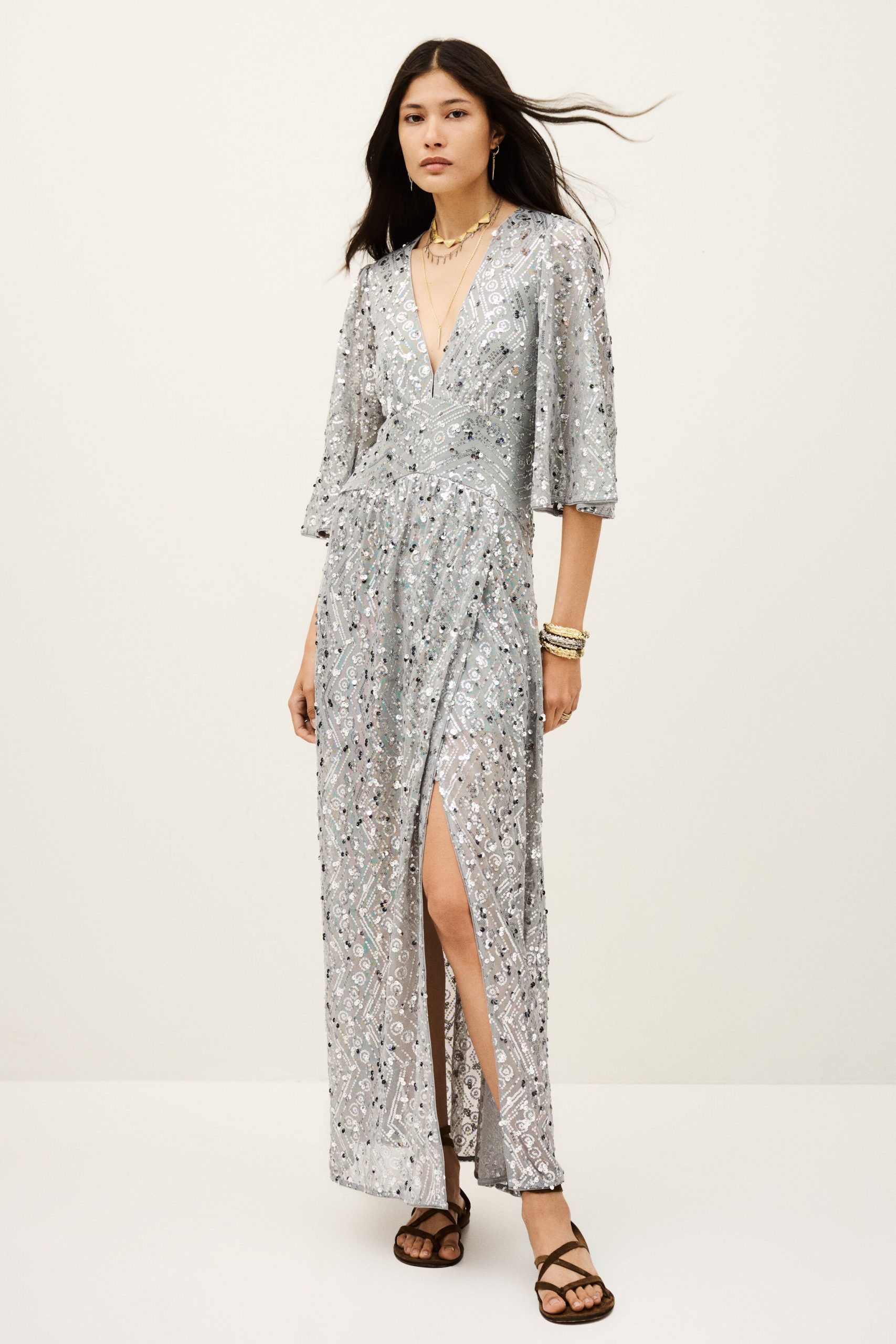 – Maxi length- Flared- Plunging V-neckline- Short and loose-fitting kimono style sleeves- Fitted waist- Gathered front and backThis model contains recycled synthetic fibers.