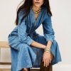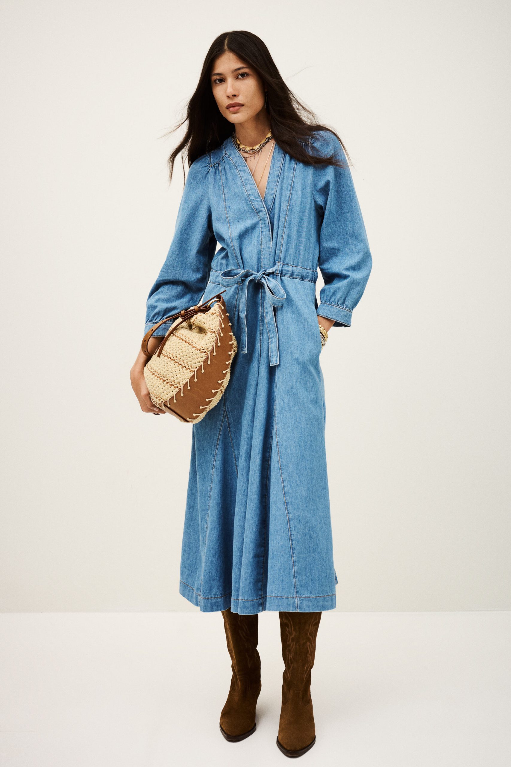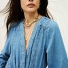 – Midi length- Flared- Long buttoned sleeves- V-neckline- Drawstring waist- Raglan pockets on the side- Gathered lookThe cotton fibers in this model come from organic farming.