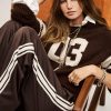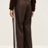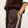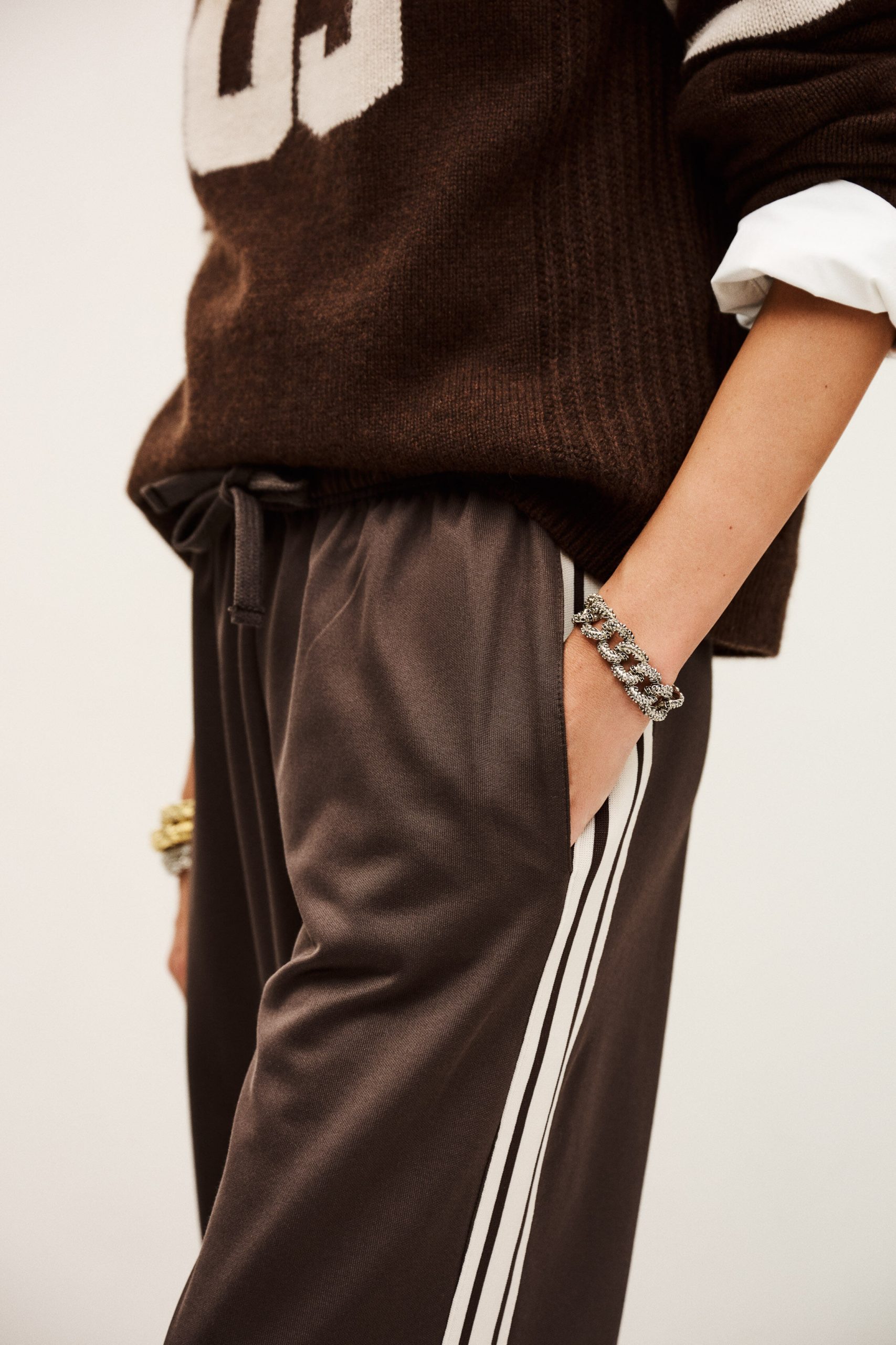 – Vintage 1980s look- Stripes- Soft polyjersey- Knit jersey stripe on the sides- Contrasting zipper highlighting the stripes and the 1980s look- Drawstring hems for a puffed effect- Elastic waist- String detail- Brown cotton in front on the waist- Straight and wide legs