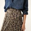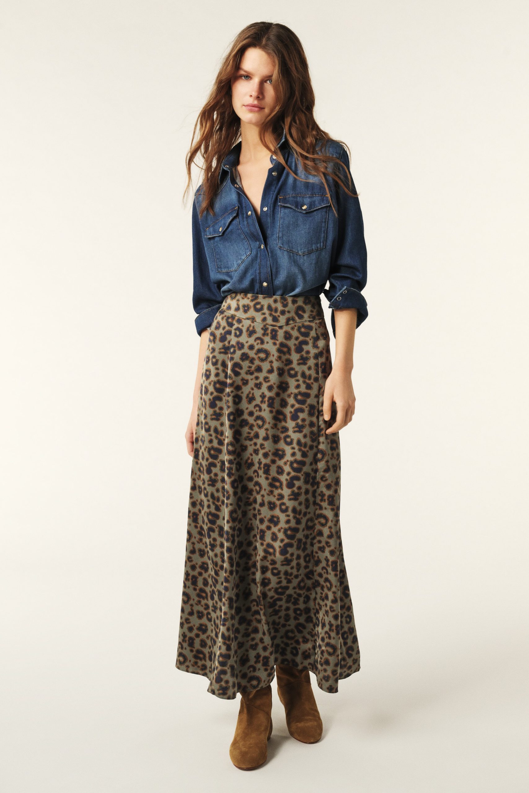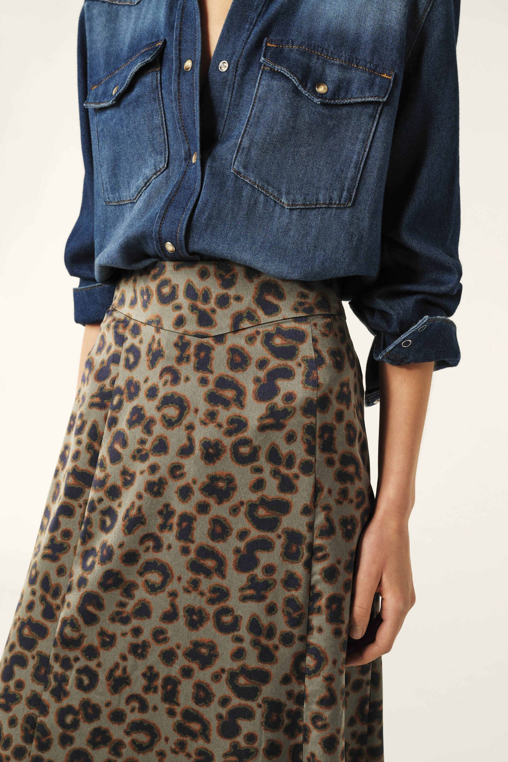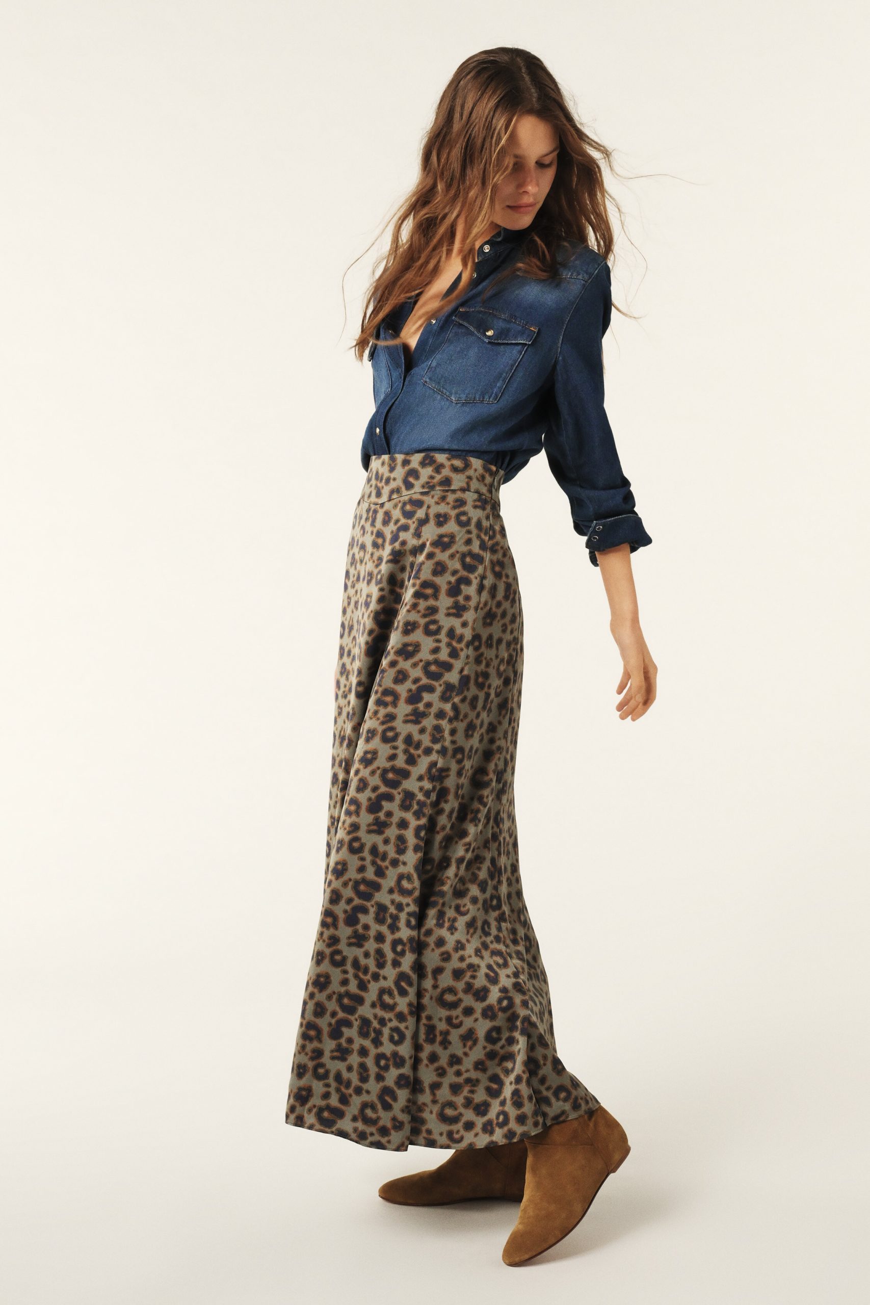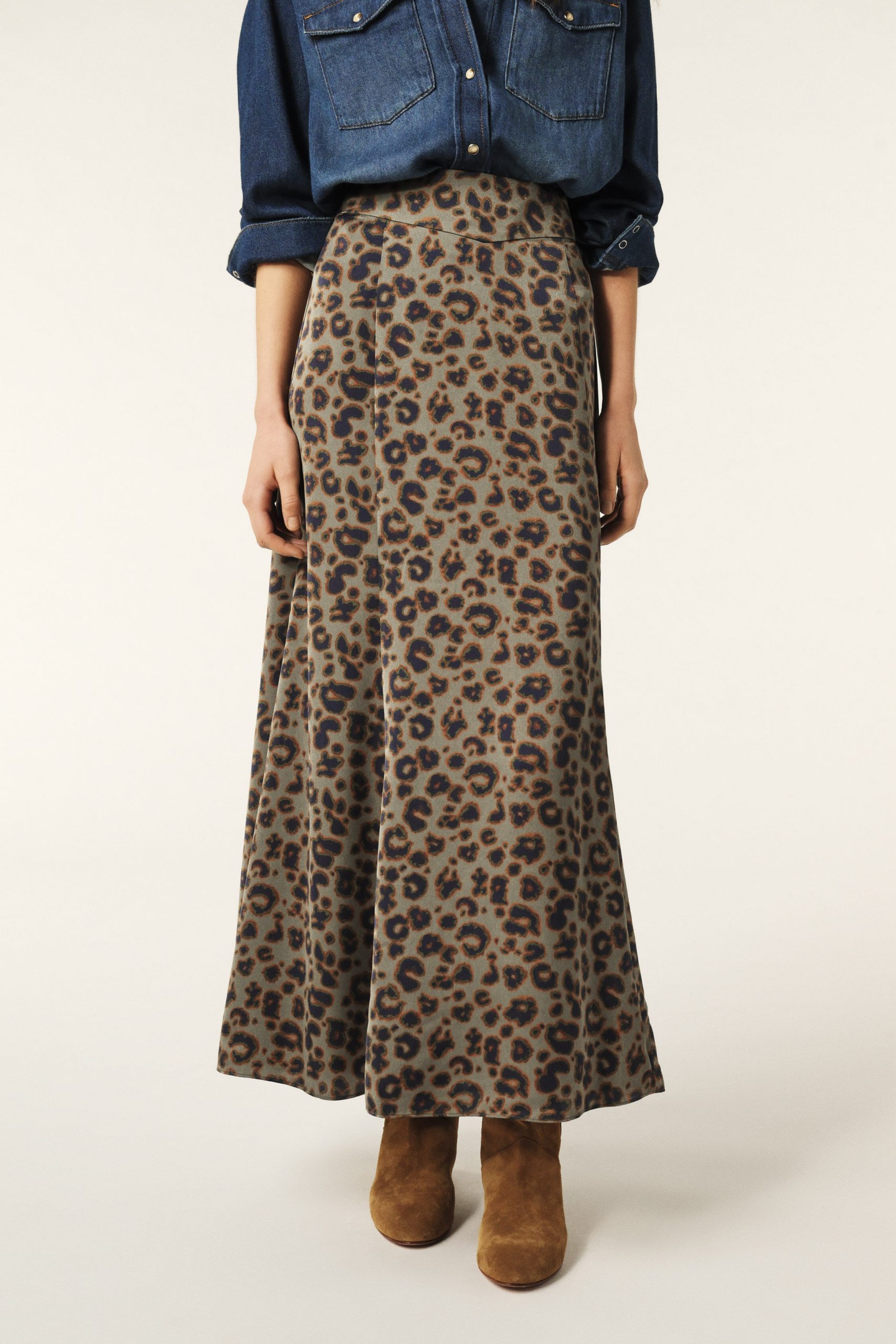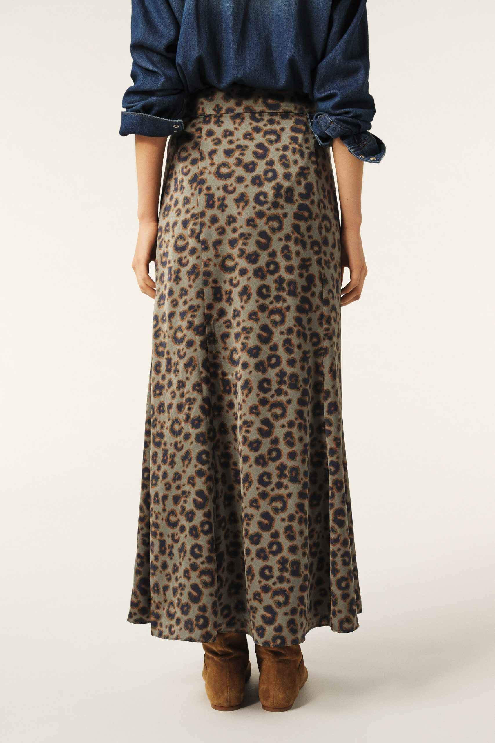 – Long length- Godet style- Leopard print- Triangular cut at the waist- Side zip fastening- This item is made with recycled synthetic fibers.