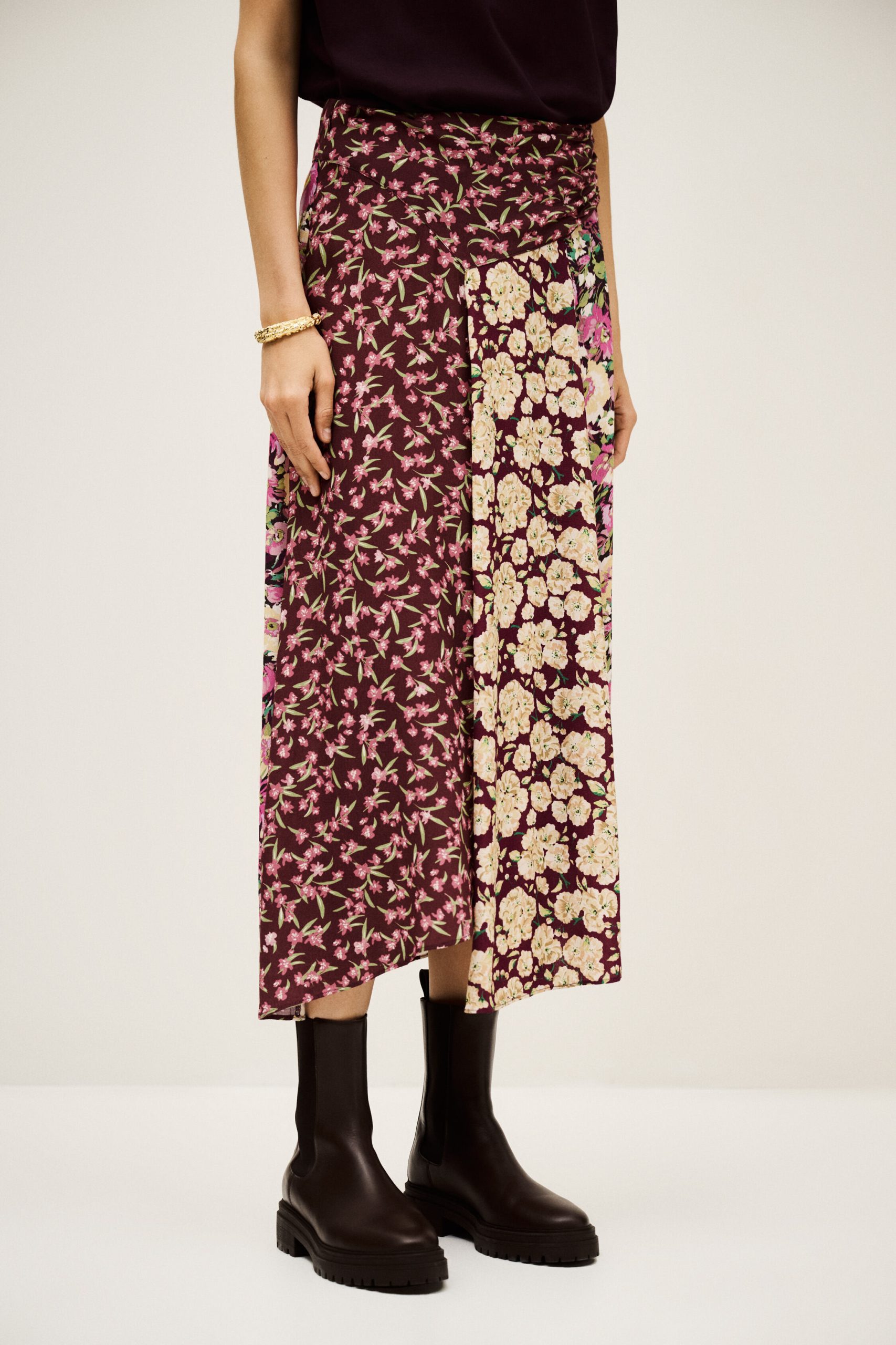 – Asymmetrical cut- Mix of prints- Hip yoke- Flared base- Gathered godets- Zip-up sideThis model contains LENZING™ ECOVERO™ viscose, a fiber made from wood pulp from sustainably managed forests. LENZING™ and ECOVERO™ are trademarks of Lenzing AG.The viscose in this model is made from wood pulp from sustainably managed forests.