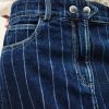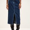 – Midi column cut- High waist- Double metal buttons at waist- Rounded front and patch back pockets- Slit for easy movement- Engraved metal hook detail at waistband- Striped denimThe cotton fibers in this model come from organic farming.
