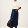 – Midi column cut- High waist- Double metal buttons at waist- Rounded front and patch back pockets- Slit for easy movement- Engraved metal hook detail at waistband- Striped denimThe cotton fibers in this model come from organic farming.