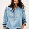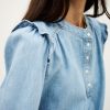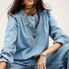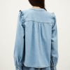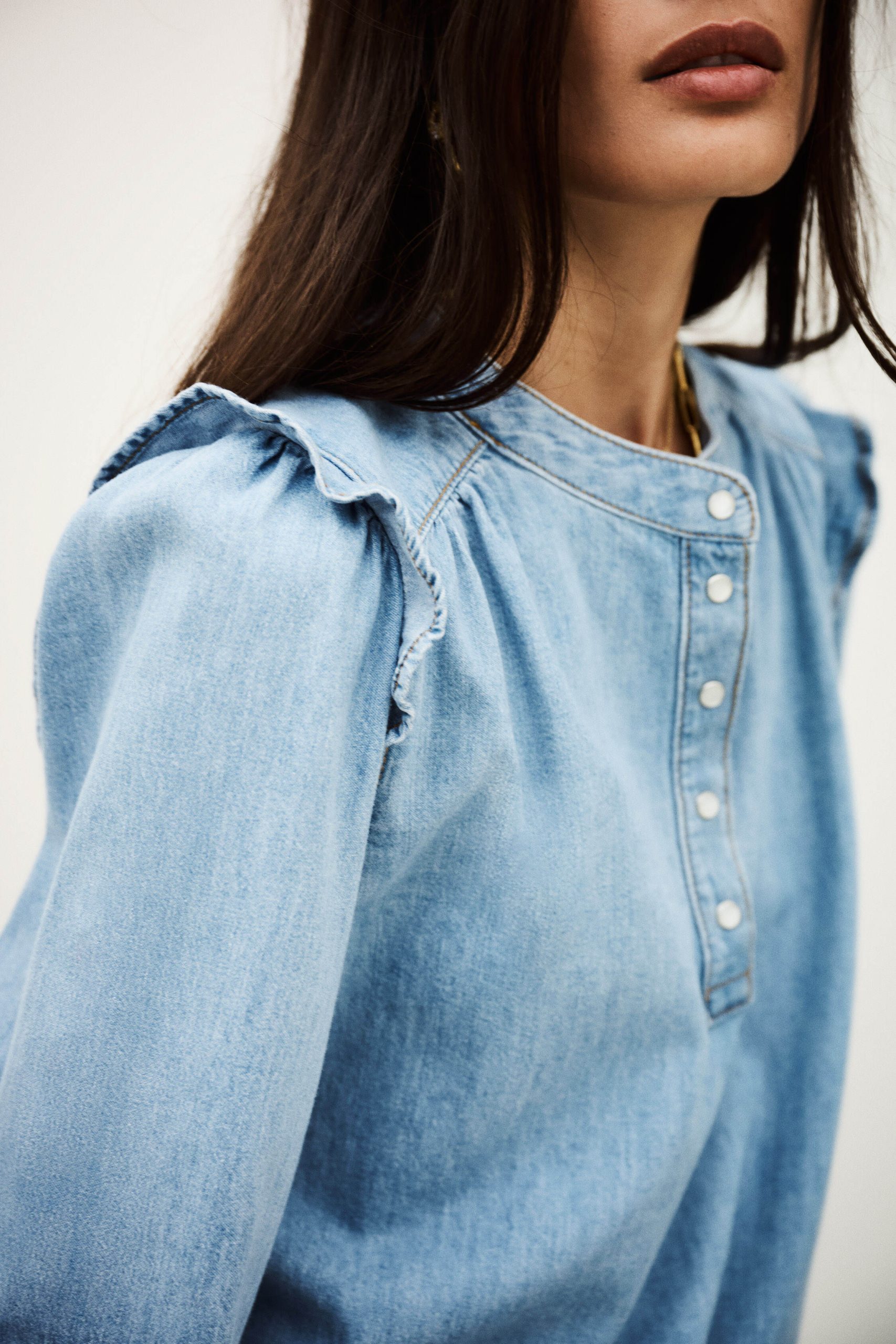 – Shirt style- Frilly stand-up collar- Long sleeves- Button tab in front- Mother-of-pearl buttons- Frilly cuffs- Gathered back- Denim materialThe cotton fibers in this model come from organic farming.