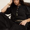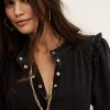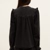 – Shirt style- Frilly stand-up collar- Long sleeves- Frilly cuffs- Button tab in front- Mother-of-pearl buttons- Gathered back- Rounded hemThe cotton fibers in this model come from organic farming.