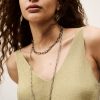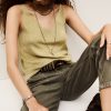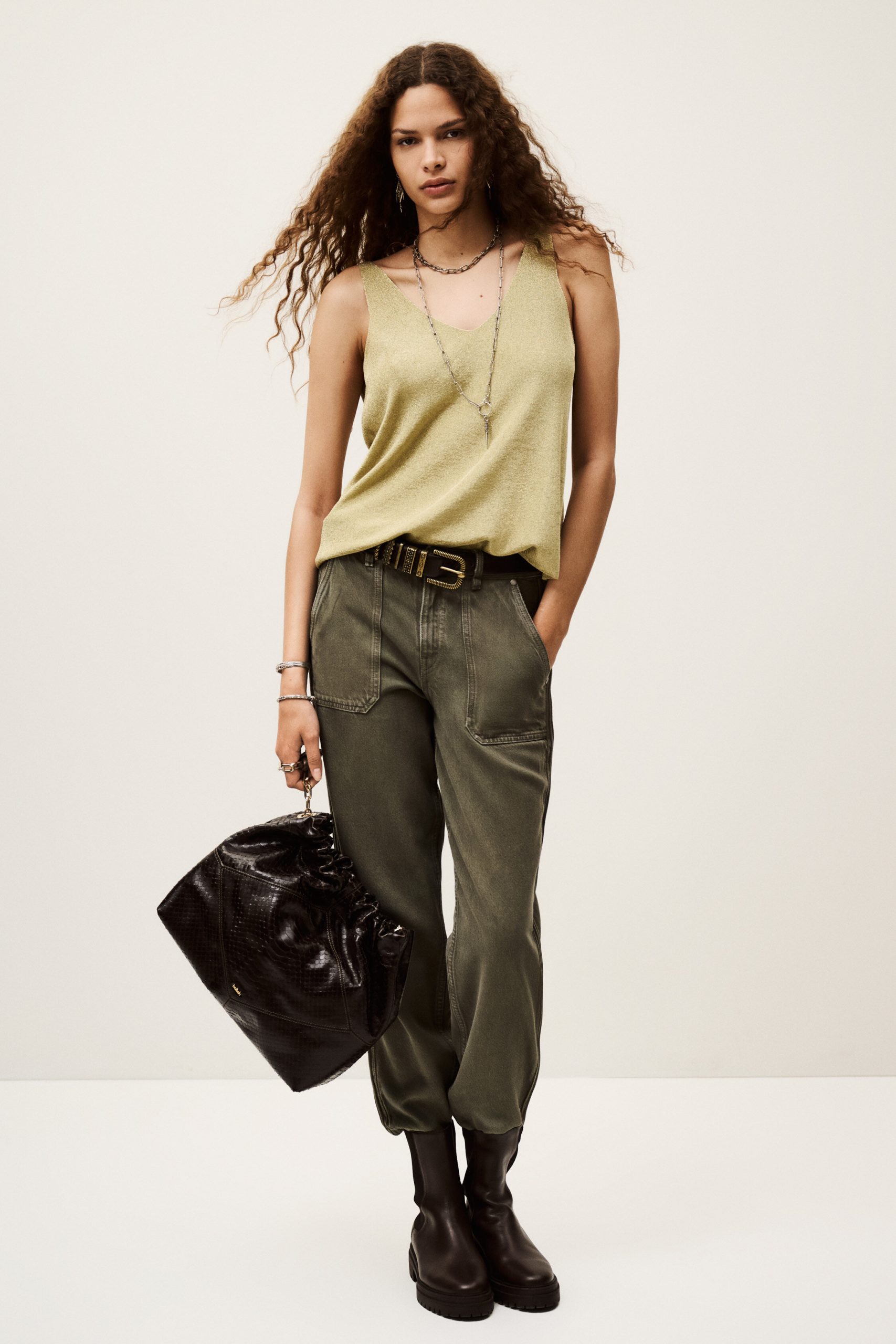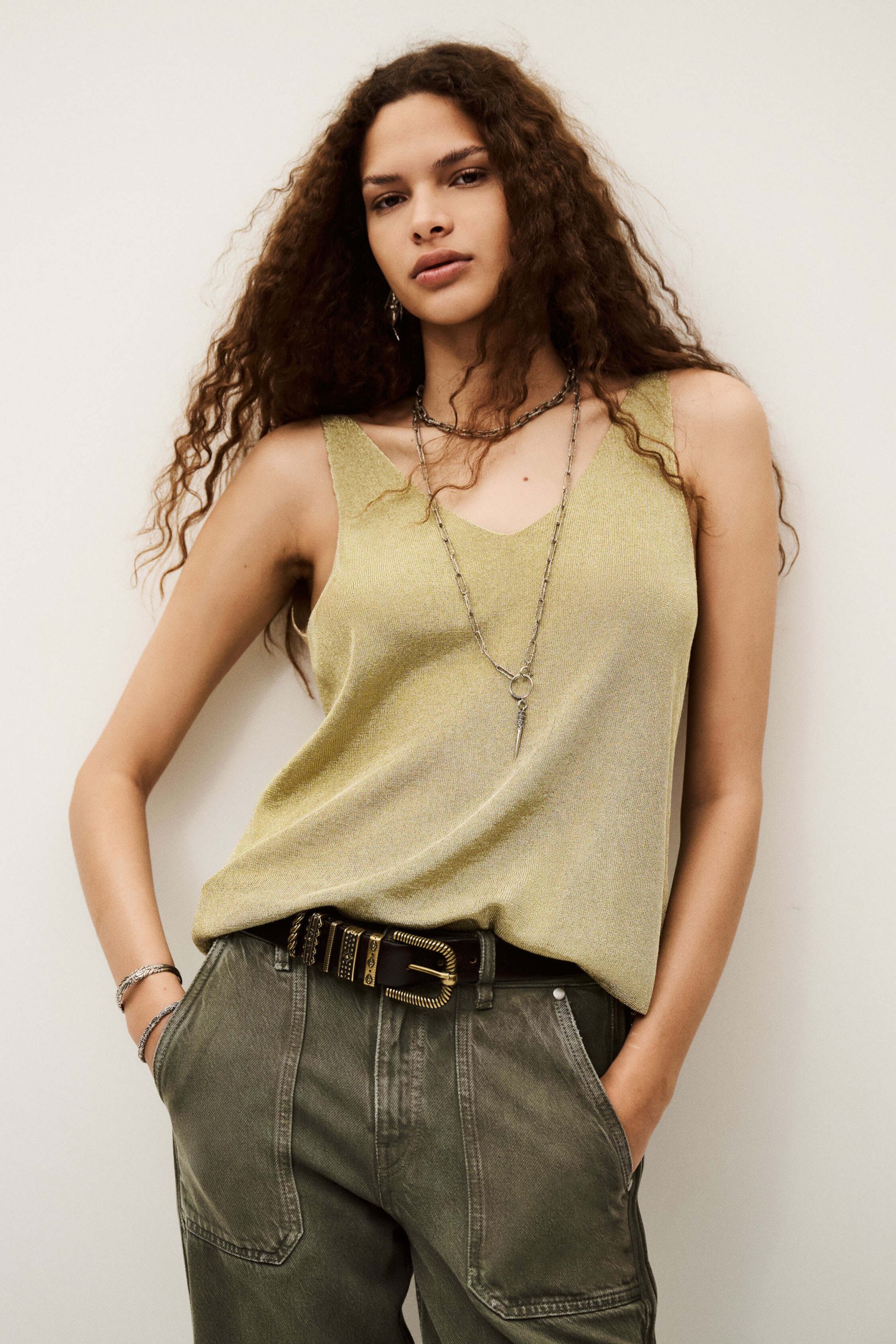 – Metallic knit- Low-cut V-neckline in back- Compact knit- Straight and flowingThe viscose in this model is made from wood pulp from sustainably managed forests.