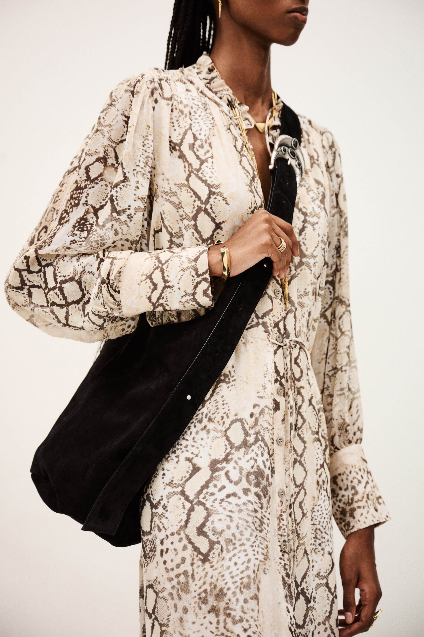 The YouYou bag. The iconic carryall. Designed with a long, wide strap and an exclusive crescent buckle, the YouYou bag is just the thing for creating modern, casual, and bohemian looks. Made of Italian suede or classic, vintage style Italian leather, this ba&sh bucket bag is both super spacious and effortlessly elegant. Wear it over the shoulder or crossbody style, and show off its flashy, totem style, jewel-bedecked buckle. A must-have bag highlighted by exquisite materials: Italian suede or genuine, vintage style Italian leather, carefully selected from LWG-certified tanneries, 100% Italian craftsmanship.- Double metal buckle developed exclusively for ba&sh- Lots of room for belongings- Soft to the touch- Wide adjustable strap- Worn on the shoulder or crossbody style- Done up with a hidden snap button- Perfect for casual chic looks, no matter the season- 100% vintage style calfskin leather- Made in ItalyThis product was made from leather from a tannery certified according to the Leather Working Group protocol.
